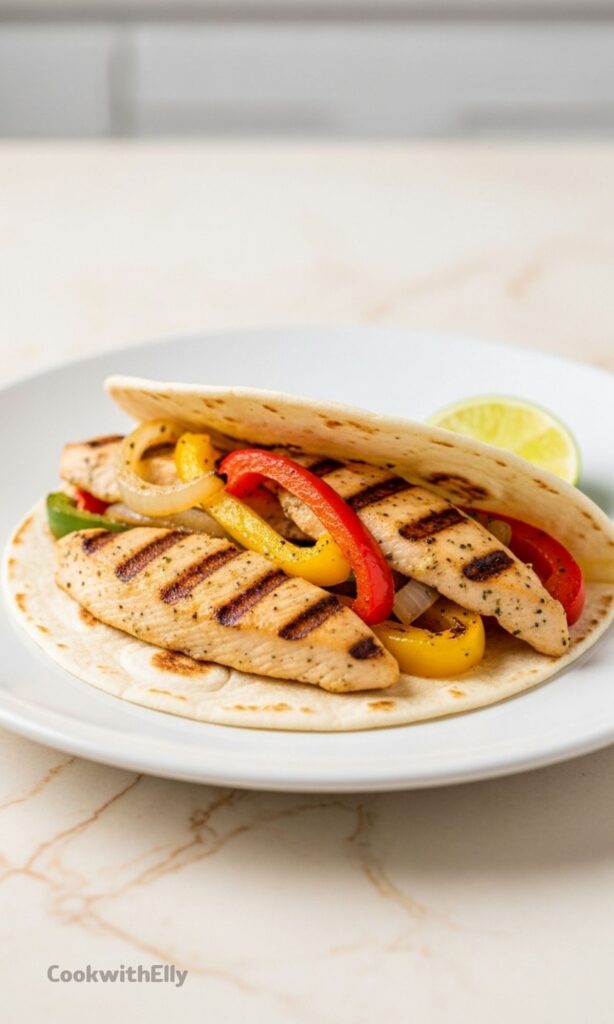 Assemble fajitas by filling warm tortillas with chicken and vegetables. Serve immediately with desired toppings.