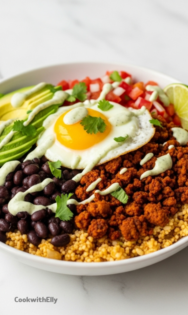 This version leans into eggs, spiced cauliflower rice, black beans, and chorizo, with fresh toppings to balance everything out. It’s hearty, colorful, and honestly hard to get bored of.