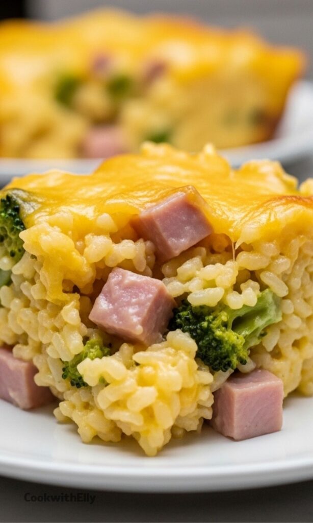 • Protein Swap: Replace ham with an equal amount of leftover turkey, rotisserie chicken, or even cooked sausage. • Veggie Variations: Add peas, carrots, corn, or cauliflower for extra color and nutrition. • Rice Tip: Long-grain white rice works best; avoid instant rice as it may become mushy. • Make Ahead: Assemble the casserole (without baking), cover, and refrigerate up to 24 hours. Add 10–15 minutes to bake time if cooking from cold. • Storage: Keep leftovers in an airtight container in the fridge for up to 4 days. Reheat individual portions in the microwave or the whole dish in a 350°F oven until warmed through.