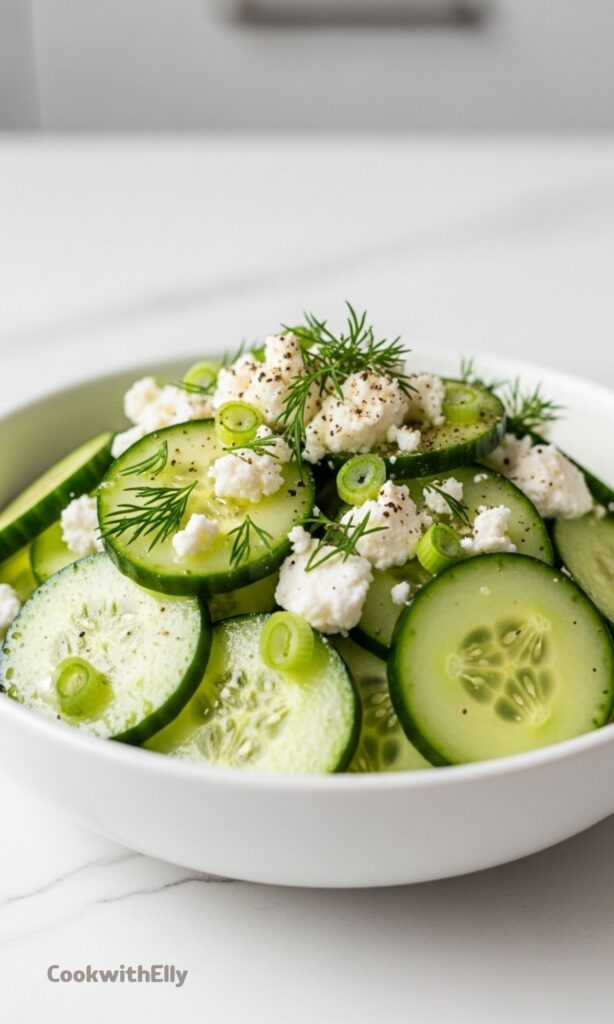 In a large serving bowl, combine the sliced cucumbers, crumbled feta cheese, chopped green onions, and fresh dill.Reserve a little feta and dill for garnish if desired. -
