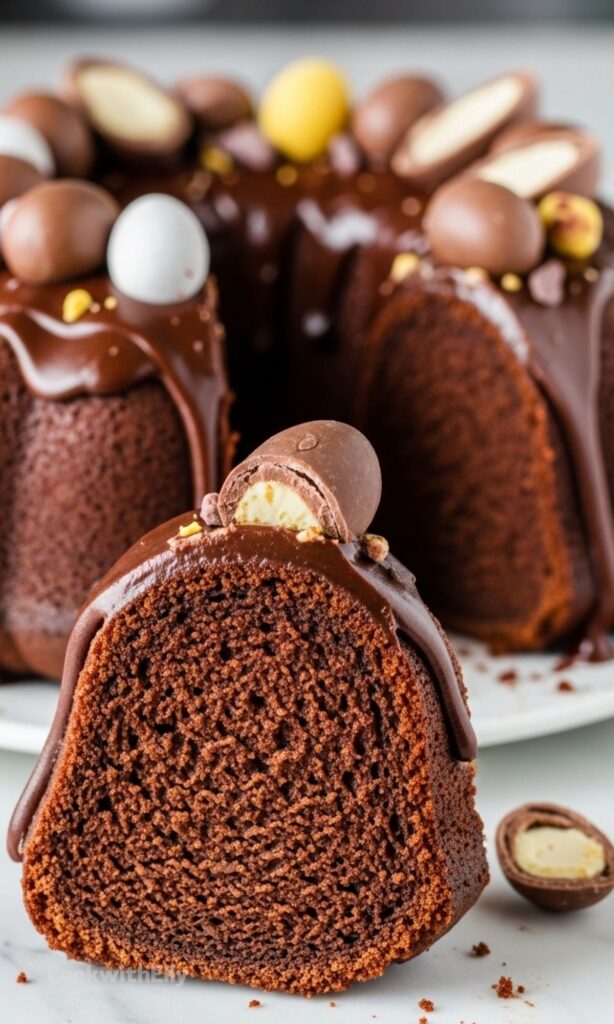 Once it’s baked and topped with chocolate icing and Easter treats, it turns into something that feels festive without trying too hard. It’s the kind of cake people gather around, slice by slice, until suddenly it’s gone.