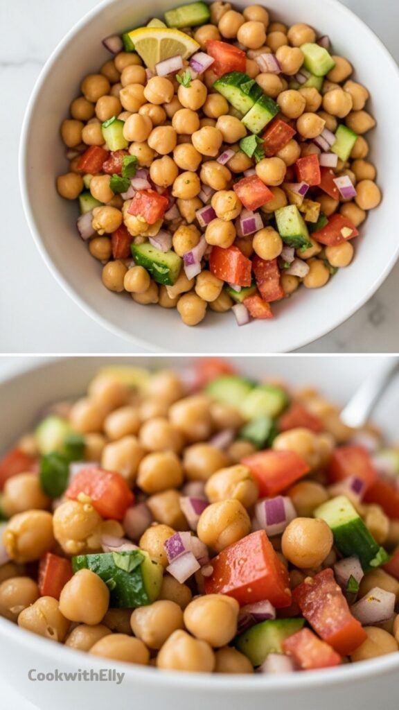Combine Ingredients – In a large mixing bowl, add chickpeas, diced red onion, tomato, and cucumber.