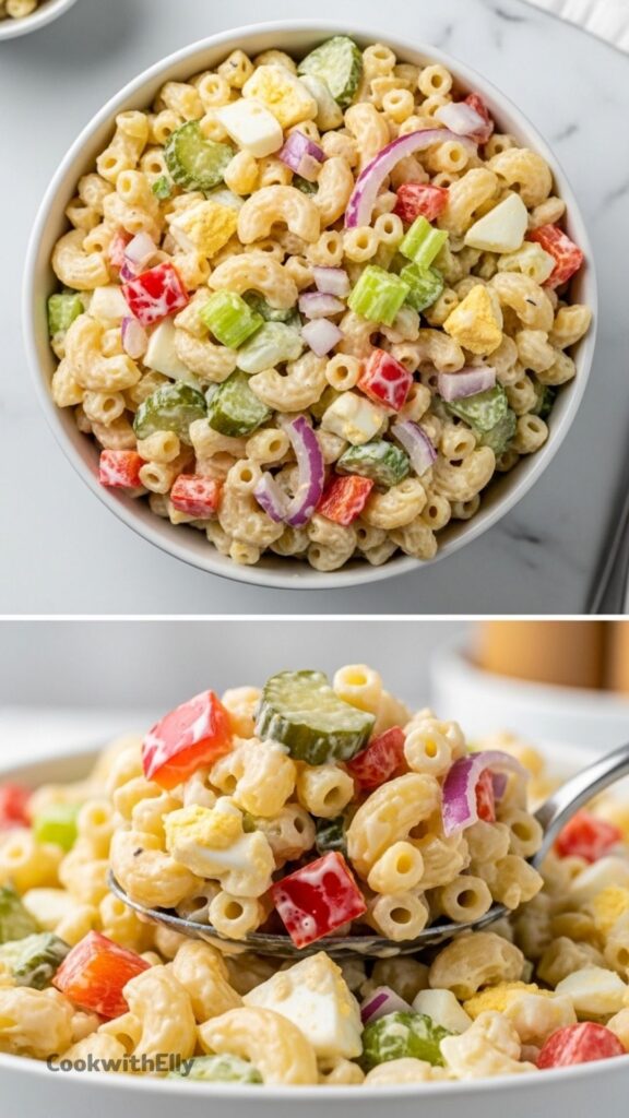 The texture is what keeps me coming back. Soft pasta, crisp celery, tiny pops of pickle. It’s not just creamy, it’s layered.