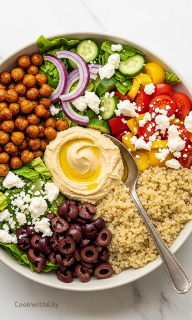 This Mediterranean bowl features crispy roasted chickpeas served over fresh lettuce and veggies with fluffy quinoa, all topped with creamy hummus and feta cheese. Filling, healthy, and perfect for meal prep.