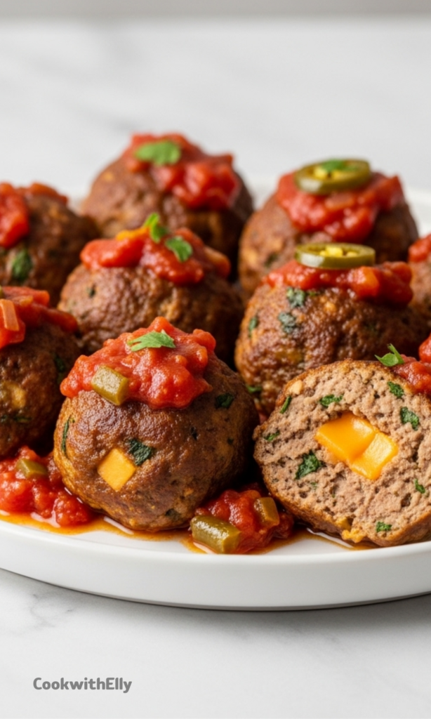 A crowd-pleasing dish, these spicy Mexican donkey balls feature tender ground beef seasoned with cumin, chili powder, and smoked paprika. Cheddar cheese and chopped jalapeño add richness and a kick, while crushed tortilla chips provide a savory crunch. Once seared, the meatballs simmer in tomatoes with green chilies, infusing them with zesty flavor. Perfect for gatherings or weeknight dinners, finish with a squeeze of lime for extra brightness and enjoy them hot straight from the skillet.